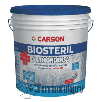 Biosteril anticondensa è un rivestimento termico murale traspirante del Colorificio Carson. Pittura murale opaca a finitura bianca con un ottimo potere riempitivo. Tra le proprietà troviamo anche la formulazione con microsfere cave di vetro che crea un rivestimento termico murale trasparente, sanitizzante, termoisolante, fonoassorbente oltre che antibatterica. Prodotto a tecnologia EBT (Encapsulated Biocide Technology) che, oltre a ridurre la dispersione di calore attraverso le pareti, impedisce la formazione di muffe, alghe e funghi. Questo prodotto è quindi ideale per tutti gli ambienti interni dove vi è grande presenza di umidità e questo vale per cucine industriali, mense, saune, caseifici ecc.