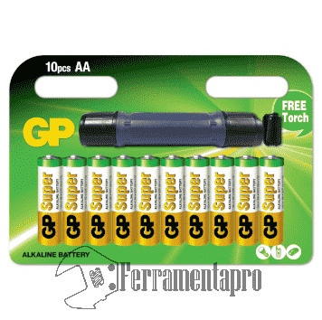 Il blister di stilo alcaline (AA) della GP Batteries contiene 10 batterie da 1,5V in formato stilo e con in omaggio una comoda torcia a led.