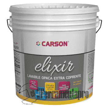 Il prodotto Elixir della Carson è un’idropittura lavabile opaca extracoprente ad altissimo punto di Bianco. A base di copolimeri vinilversatici in dispersione acquosa che conferiscono al prodotto un’ottima resistenza agli agenti atmosferici ed agli alcali.