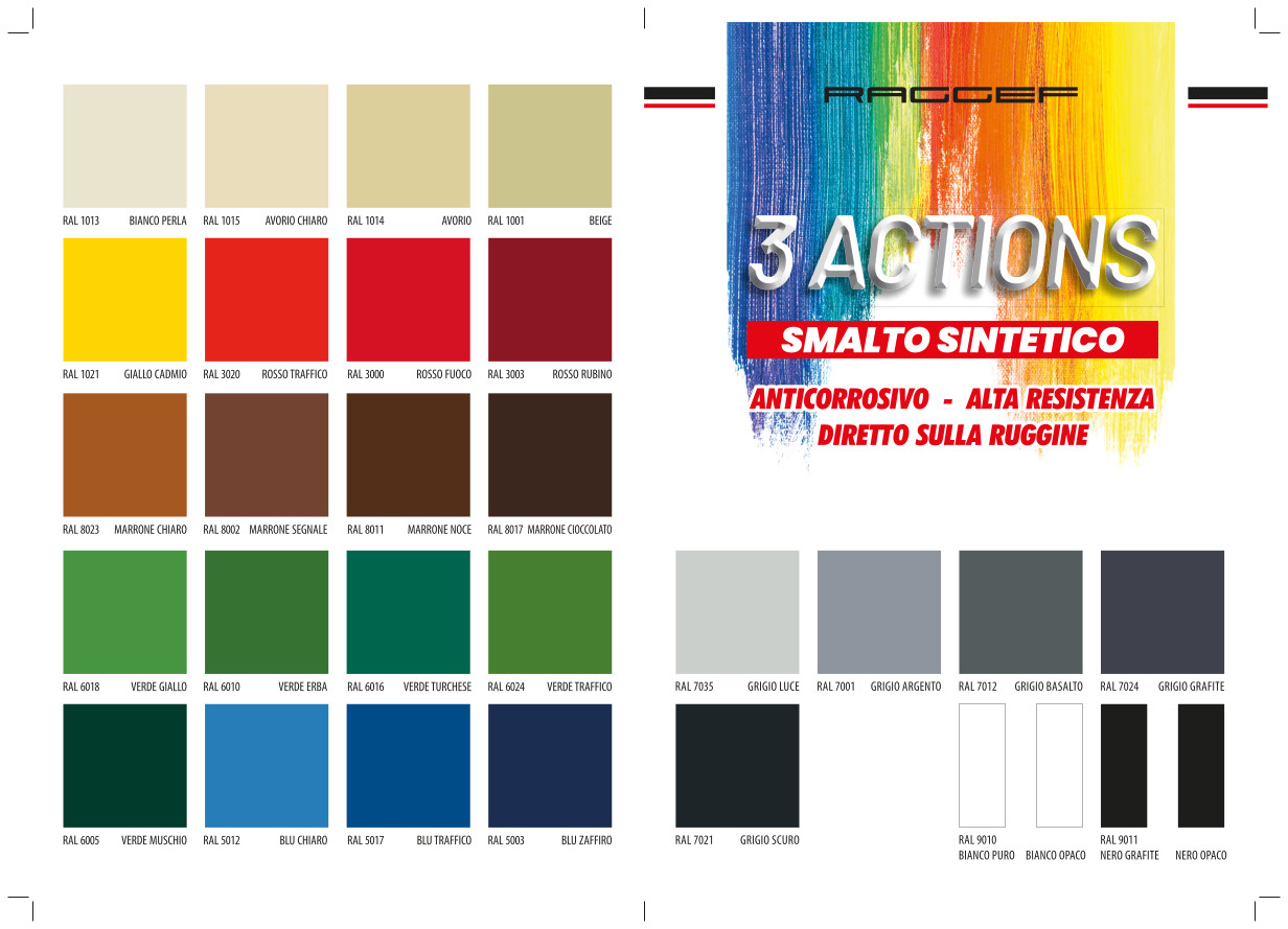 - Colori: Bianco Perla, Avorio Chiaro, Avorio, Beige, Giallo Cadmio, Rosso traffico, Rosso fuoco, Rosso Rubino, Marrone Chiaro, Marrone Segnale, Marrone Noce, Marrone Cioccolato, Verde Giallo, Verde Erba, Verde Turchese, Verde Traffico, Verde Muschio, Blu Chiaro, Blu Traffico, Blu Zaffiro, Grigio Luce, Grigio Argento, Grigio Basalto, Grigio Grafite, Grigio Scuro, Bianco Puro, Bianco Opaco, Nero Grafite, Nero Opaco.