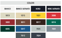 - Colori: Bianco Perla, Avorio Chiaro, Giallo Cadmio, Grigio Chiaro, Rosso Fuoco, Blu Traffico, Verde Bottiglia/muschio, Verde Turchese, Grigio Argento, Grigio Basalto, Grigio Grafite, Grigio Luce, Marrone Segnale, Marrone Noce, Marrone Cioccolato, Base Intermedia, Base Intermedia Satinata, Base Neutra, Base Neutra Satinata, Bianco, Bianco Satinato, Nero, Nero Satinato.
