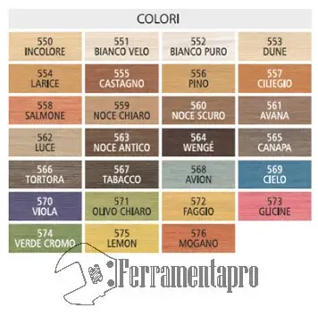 - Colori: Incolore, Bianco Velo, Bianco Puro, Dune, Larice, Castagno, Pino, Ciliegio, Salmone, Noce Chiaro, Noce Scuro, Avana, Luce, Noce Antico, Wengé, Canapa, Tortora, Tabacco, Avion, Cielo, Viola, Olivo Chiaro, Faggio, Glicine, Verde Cromo, Lemon, Mogano – Crea il tuo colore con Infinity Colorsystem