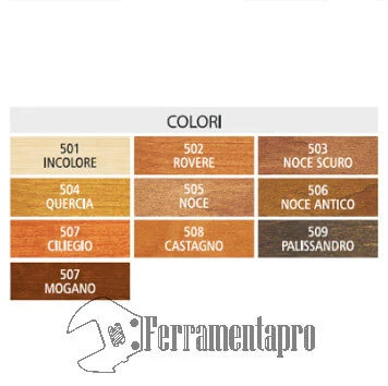 - Colori: Incolore, Rovere, Quercia, Noce, Noce scuro, Noce antico, Ciliegio, Castagno, Palisando, Mogano.